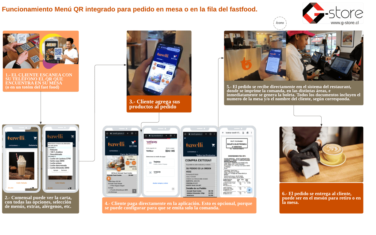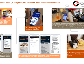 El cliente simplemente escanea el código QR en la mesa y la aplicación se abre con todos los productos del menú. Desde allí, el cliente puede seleccionar sus productos, agregar extras, aprovechar promociones y revisar los ingredientes de cada artículo, incluidos los alérgenos. Una vez que haya terminado de elegir, puede proceder al pago, donde tiene la opción de dejar propina y pagar con tarjeta. Una vez completado el pedido, este se carga automáticamente en el sistema del restaurante, generando las respectivas comandas y la boleta.